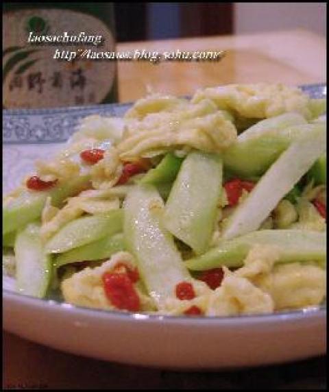 2.鸡蛋炒熟后放入泡过的芥兰片和泡过的枸杞子翻炒几下即成。