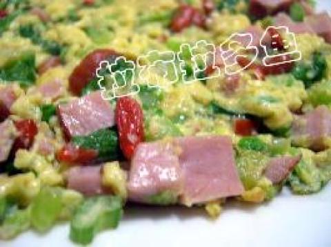 芹菜叶,鸡蛋,火腿,枸杞,油,盐