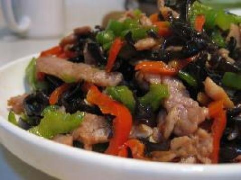 3.起油锅,锅里放入适当的油,油热后倒入青椒丝,红椒丝,木耳丝,翻炒去生后铲出待用!