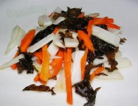 2、炒锅油热爆香辣椒、蒜片,放白菜条、胡萝卜条、木耳翻炒,加醋、糖、盐即可。