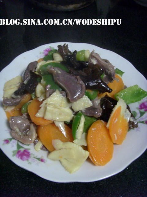 鸭肫三个,胡萝卜半个,冬笋半个,青椒1个,黑木耳50克