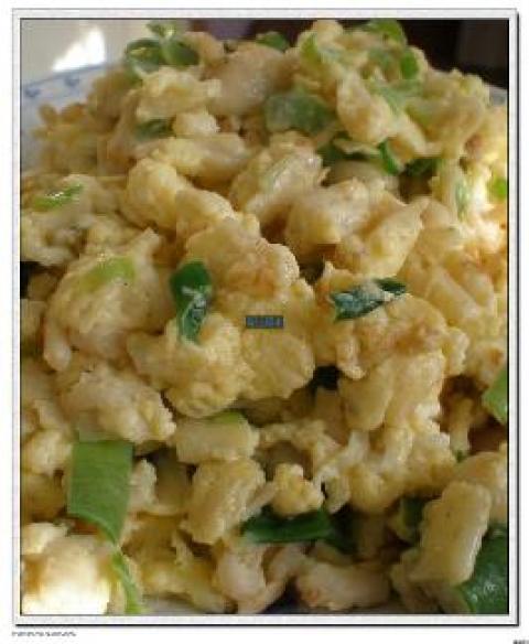 3、锅中放少量油,将鸡蛋炒熟划散。