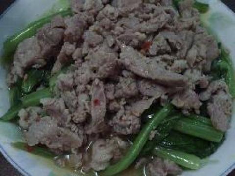 3.炒锅放油,倒入腌好的肉片炒熟,盛在青菜上即可。