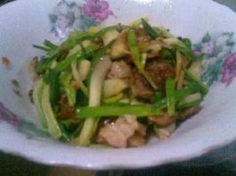 3.放油烧锅,把摘好的藠头炒过2分钟,跟着下腊肉和藠叶,放少许干椒粉翻炒,然后放鸡精,炒4-5分钟起锅,上桌了。