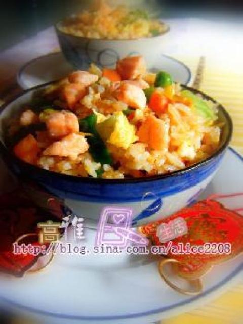 材料香米饭150克,鸡蛋1只,葱花10克,三文鱼50克,青豆5克,冬笋丁5克,水发香菇丁5克调味料味精2克,植物油250cc,盐、胡椒粉少许做法1、把三文鱼切成0.8cm的方丁。2、在滑过油的热锅中入油250cc,烧至四成热时先放入三文鱼。3、然后再放入一,过油后一起沥出。4、锅中留30cc油,放入打散的蛋液炒匀,再放入