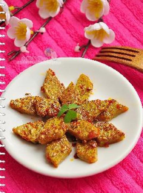 3.不烫手时切成条或片,炒勺内加底油,放入实蛋。加辣酱,糖,盐。芝麻孜然炒匀出锅即可。