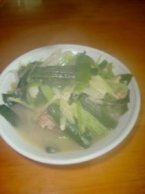 2.炒锅中爆香猪肉后把大蒜和芹菜倒下去炒,我家喜欢吃烂点的大蒜,所以加水煮多一会。最后调味即可。