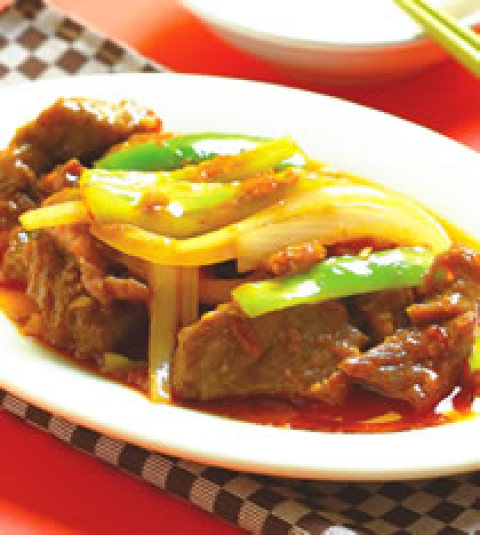 5.于作法4锅中倒入高汤、细糖、青椒及洋葱转大火快炒约10秒,加入作法3牛肉快炒5秒后加入太白粉水勾芡即可。