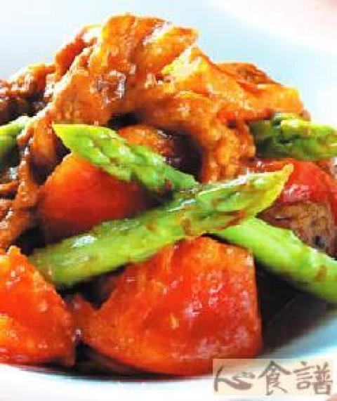 4.作法3原锅再倒入1大匙沙拉油,放入作法2的芦笋段、蕃茄块拌炒均匀,再加入作法3的薄牛肉片与作法1的调味料充分拌炒入味即可。