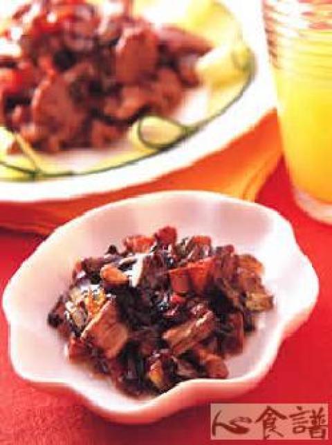 主料:五花猪肉150克,黄瓜250克,辅料:水发木耳5克,大葱25克,调料:芝麻油75克,鸡汤50毫升,辣椒酱10克,精盐2克,酱油25克