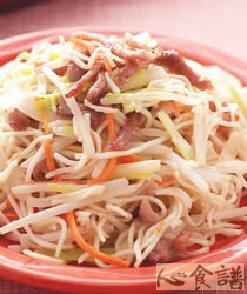 细阳春面250公克,猪肉丝100公克,红萝卜20公克,洋葱40公克,韭黄30公克,盐1/2茶匙,糖1/2茶匙,胡椒粉1/4茶匙,盐1/4茶匙,酱油1/2茶匙,米酒1/2茶匙,胡椒粉1/4茶匙,太白粉1/2茶匙