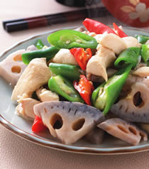 4.热锅倒入葵花籽油,爆香作法1辣椒片、碧玉笋段,再放入作法3莲藕片和黑胡椒素鸡块拌炒均匀。