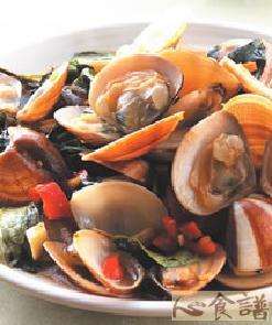 3.作法2炒至海瓜子全部开口后,放入作法1的九层塔,再约略翻炒,最后滴入香油即可。