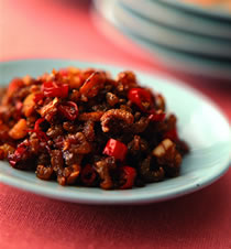 (2)将炒锅预热,加入沙拉油,依序放入虾米、蒜末、朝天椒末等爆香,使之呈现干焦状后,再加入全部调味料,拌炒均匀至入味后,即可盛起食用。