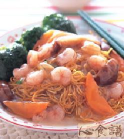 熟面150公克,虾仁100公克,香菇3朵,姜片4片,红萝卜20公克,青花菜80公克,高汤300㏄,太白粉水30㏄,米酒少许,盐1/2小匙,白砂糖1/4小匙