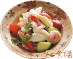 虾仁150公克,小黄瓜块60公克,茭白笋块60公克,红甜椒片40公克,蒜末10公克,红辣椒片10公克,盐1/4小匙,鸡粉1/4小匙,细砂糖少许,香油1小匙,乌醋1小匙,盐少许,米酒1小匙,胡椒粉少许,葱段5公克,姜片5公克