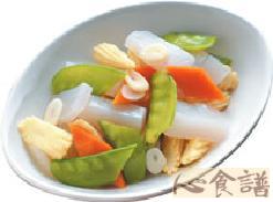 3.热锅,倒入1大匙的沙拉油烧热,以中火爆香蒜片,加入作法2的玉米笋块、红萝卜片、蒟蒻片、所有调味料以及少许冷开水(份量外)拌炒约1分钟,再加入作法2的碗豆荚拌炒均匀即可。