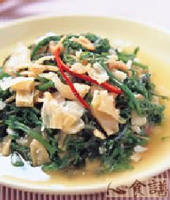 厥菜含多种维生素和矿物质,对高血压、风湿性关节炎等症均有疗效,是绿色环保食品。水蕨扣笋成菜美观,鲜香嫩脆,清淡味美。接待任务菜肴,也深受公众喜爱。主料水笋肉 水蕨菜调料精盐 味精 白糖 蒜茸 火腿油 豆瓣酱