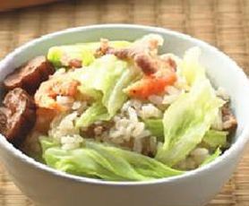 3.取一电锅内锅,盛入作法2的材料,放入电锅中,外锅加入120㏄的水(份量外),煮至开关跳起后,续焖约5分钟,接着打开锅盖将高丽菜饭拌匀即可。