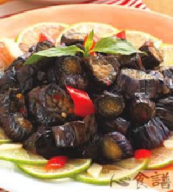 茄子3条,九层塔50公克,红辣椒2根,姜1根,葱2根,蒜仁适量,泰式辣味鸡酱1大匙,酱油膏2大匙,砂糖1小匙,20度料理米酒1大匙