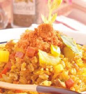 2.热油锅,将蛋打散后炒蛋,加入火腿丁、三色蔬菜、虾仁炒熟,再加入饭与调味料炒匀,最后加入凤梨略炒,装盘后加入肉松即可。