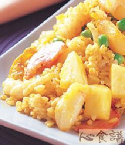 凤梨20g,白饭300g,碗豆仁5g,洋葱丁5g,香肠片10g,花技10g,蟹管肉5g,虾仁3只,鸡蛋2个,奶油1/2茶匙,鱼露1茶匙,酱油1/2茶匙,糖1/2茶匙,咖哩粉1/4茶匙