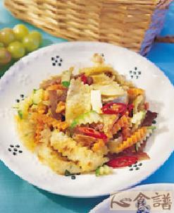 葱油派1/2根,小黄瓜条1/2条,红萝卜条1/2条,木耳1朵,盐1又1/2小匙,糖2小匙,胡椒粉1小匙,香油1小匙