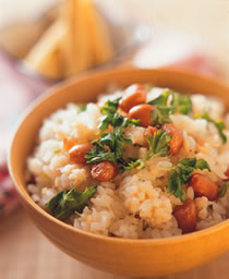 2.)将米洗净沥干水分,加入1杯水浸泡15分钟,再加入调味料拌匀,蟹肉与香菜茎末铺在米上,放入电锅中煮熟,熟后再焖15分钟。