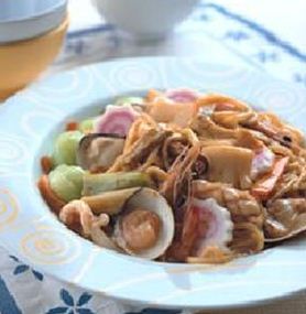 鸣户卷1/2条,蛤蜊4个,草虾4尾,花枝40公克,猪肉丝40公克,红萝卜40公克,青江菜4株,油面150公克,葱1支,水200㏄,鲜美锅汁1/2包,香菇蚝油2小匙