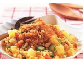 3. 热油锅,将蛋液与白饭一起下锅炒至米粒呈松散状时,将作法2的材料、凤梨及调味料b下锅炒匀入味即可盛入餐盘中,再撒上肉松及碎果仁即可食用。