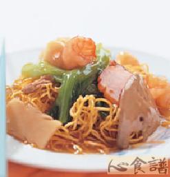 港式生面150公克,姜片10公克,葱2根,笋片40公克,叉烧肉片50公克,胡萝卜片30公克,虾仁50公克,青江菜4棵,肉片50公克,鱿鱼片50公克,猪肝片50公克,高汤250㏄,老抽2小匙,酱油2小匙,盐1/2小匙,鸡精粉1小匙,细砂糖1/2小匙,白胡椒粉少许,太白粉1+1/2小匙,水15㏄,香油1小匙
