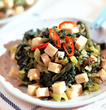 3.加入作法1的雪菜丁、百页豆腐片及所有调味料炒匀即可。