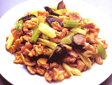2.合桃肉先用盐水烚一次,再用清水烚一次,然后在油中慢火炸至香脆。鸡丁先用油泡熟,西芹略出水。
