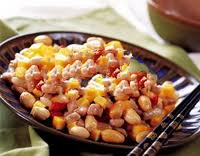 2.锅中加少许油猪肉丁炒熟,然后放蛋丁、麦冬、枸杞翻炒均匀,点入盐、味精调味,撒上花生米,即可食用。食谱特点:咸鲜适口,有益气养阴之功效。