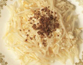 5.锅上火下油烧热,倒入上列材料及银芽,兜炒至凝固,上碟撒金华火腿蓉即成。