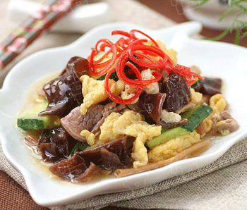 主料:木耳(水发),75克,竹笋75克,猪肉(瘦)75克,油菜75克,鸡蛋150克,