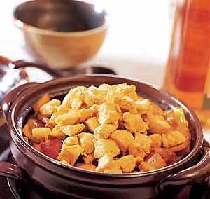 3.炒锅内放油烧热,加入葱头丁,炒至金黄色时,放入面粉和咖喱粉炒热,倒入盛鸡汤的沙锅内煮沸,加入盐、辣椒面调味。