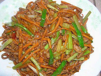 主料:瘦猪肉三两,切丝;胡萝卜三两切丝;蒜苗一两,切段;芹菜二两,切段;豆瓣一大匙,酱油三大匙,醋一咖啡匙,花椒粉,盐,鸡精适量,淀粉两大匙。