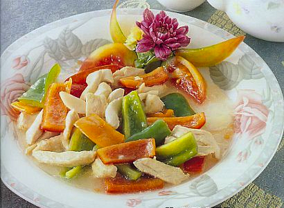 主料:嫩鸡肉(去骨)250克,熟笋肉50克,大青椒25克。葱段10克,香醋2克,湿淀粉35克,清汤25克,绍酒10克,酱油25克,白糖10克,醋2克,芝麻油15克,熟猪油750克(耗油75克)。