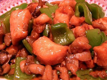 4.炒锅放在火上,加入料酒、酱油、白糖、味精、水,勾芡,放入肉丁,青椒丁,加入熟猪油(10克)翻匀,出锅即成。
