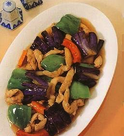 5)烧热油,依次下茄子、青椒、红椒和鸡片,泡嫩油,沥干备用;