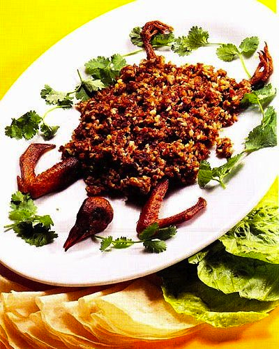 (2)烧热炒鼎倒入猪油,待油烧至五成熟时,将鸽肉下油鼎炸后,倒在笊篱,再把鸽肉下鼎炒四、五分钟,投入马蹄、韭黄、火腿末、味精、精盐、芝麻油,再炒四、五分钟,起鼎装盘。另将头、尾炸熟,砌成鸽形。上席时跟上薄饼皮,生菜叶(剪成圆形)。