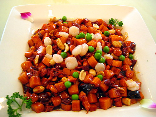 主料:鸡丁,猪肉丁,香菇丁,年糕丁(有笋丁最好,我这没有,就没放)虾仁(装饰用的,不过这么大的虾仁好久没吃了,爽!),还有松仁,没有的话可以换成花生,不过松仁比花生好吃好多