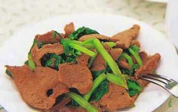 将菠菜用底油煸炒,火要旺,锅要滑,稍煸即盛起。将猪肝切片清炒,然后放入菠菜同炒,加调味品适量调味,炒熟即食。