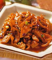 (2)嫩羊肉洗净切丝,羊肝去筋膜,洗净,切丝,皆以湿团粉拌匀。炒勺烧热后加入油,加热后放入羊肉和羊肝爆炒至熟。再加入葱丝豆豉等调料及药汤,旺火烹炖,收汁即成。