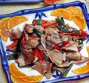 1、将猪肚片成片;青红椒切开去筋去籽洗净,用开水汆一下,捞出切成小段。