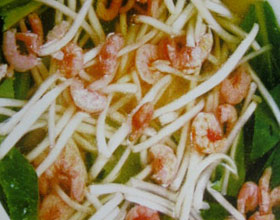 3.锅放少许油烧热,瀑香葱姜,加豆芽和虾米快炒再加精盐、味精、胡椒粉调味炒匀,加香菜段拌匀,淋入香油即成。