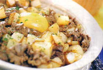 主料:薯仔1000克,牛肉100g,蛋1个,芫西碎2汤匙,牛油少许,盐,胡椒粉适量
