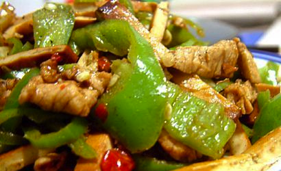 3、另下少许底油、盐,下青椒丝煸炒,这个目的是为了去除辣椒内多余水分和辣味,所以不用炒很久。