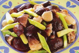 主料:鸡爪100克,辅料:干香菇60克,芦笋150克,调料:盐10克,鸡精2克,香油1克,姜2克